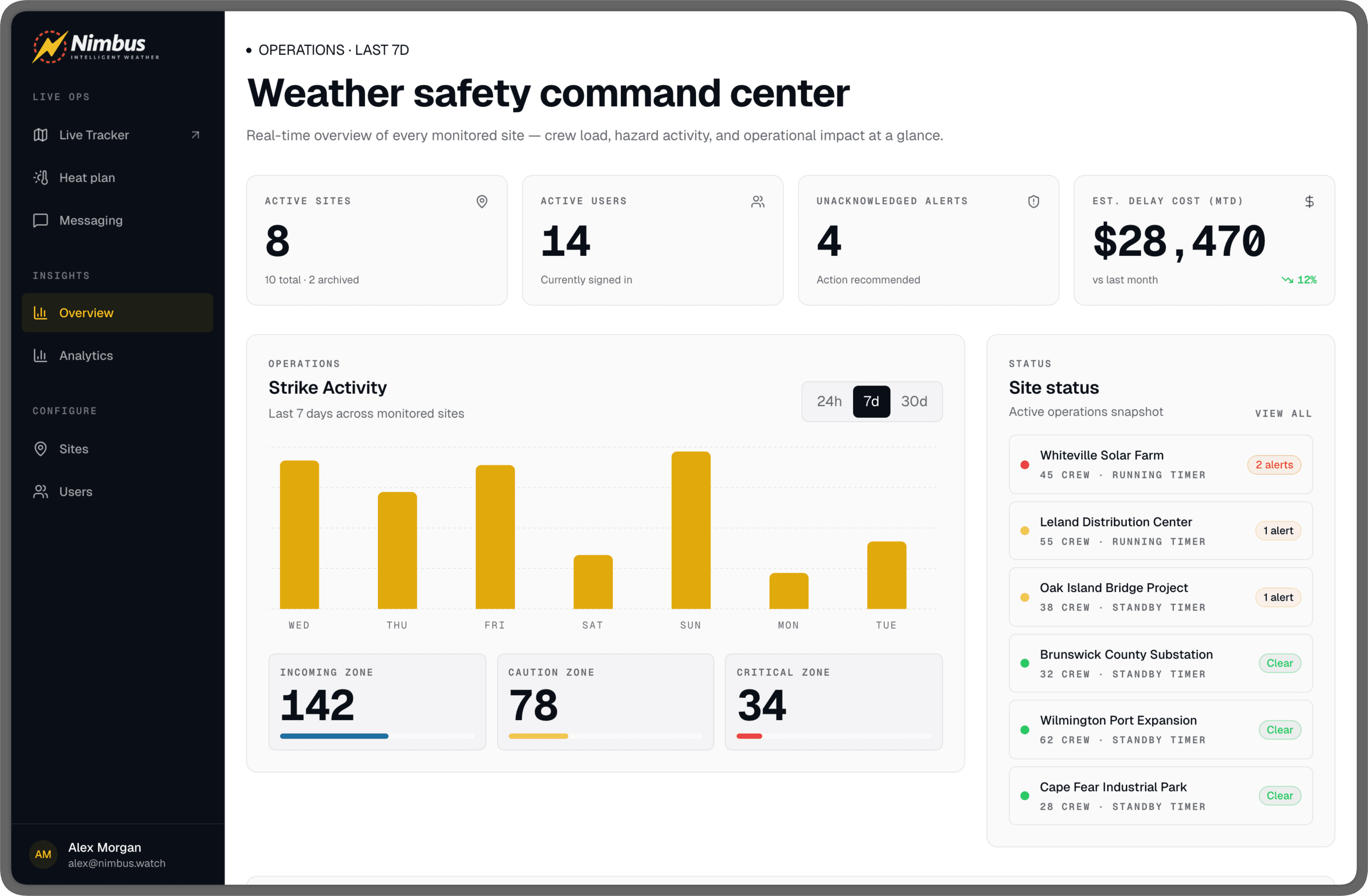 Nimbus replaces radar apps, group texts, and lightning stopwatches with a single live picture of every site — and an AI read on what each storm is going to cost you.