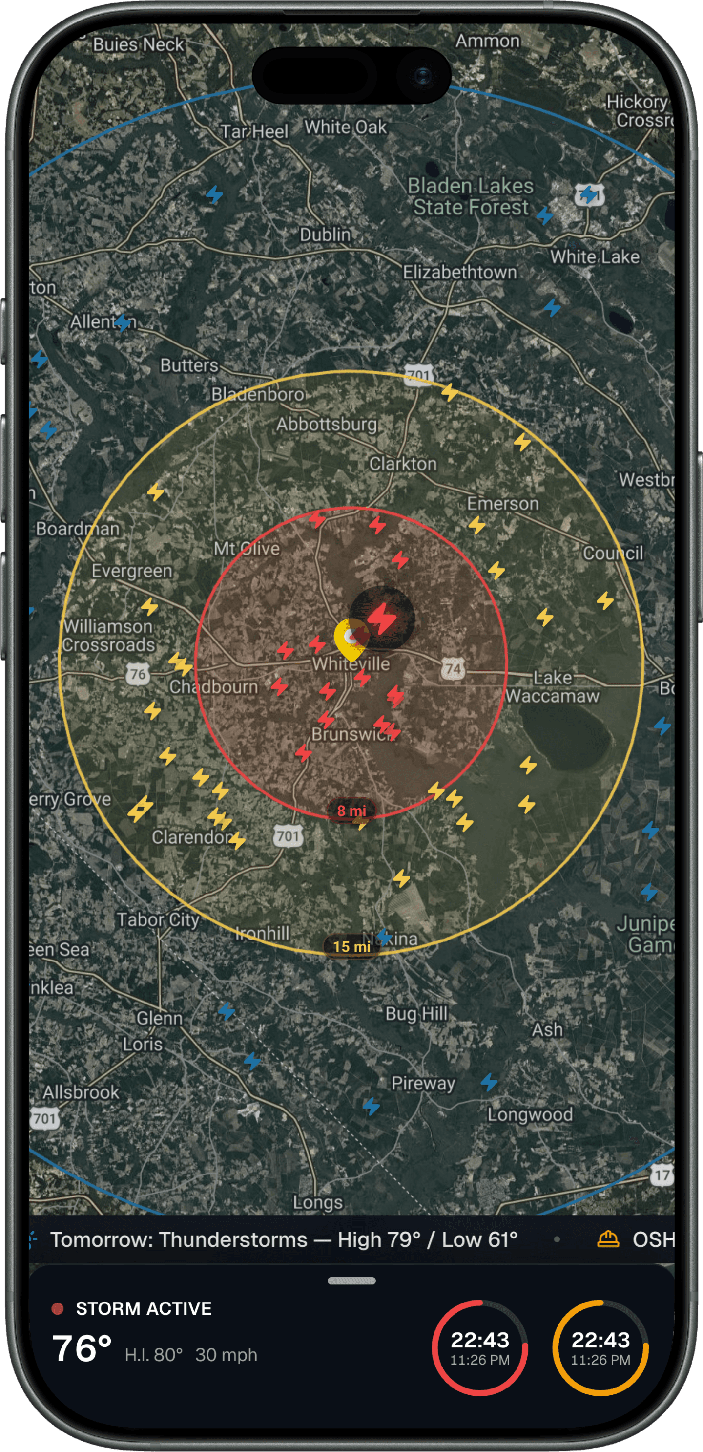 Lightning, stand-down timer, hourly forecast, severe-weather banner, emergency routing — on a phone, with no login required.